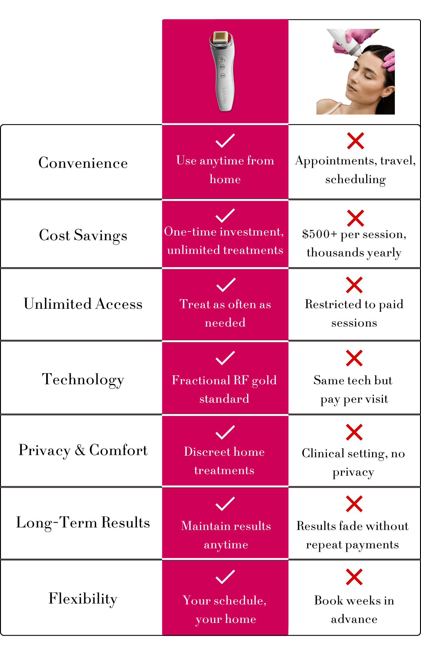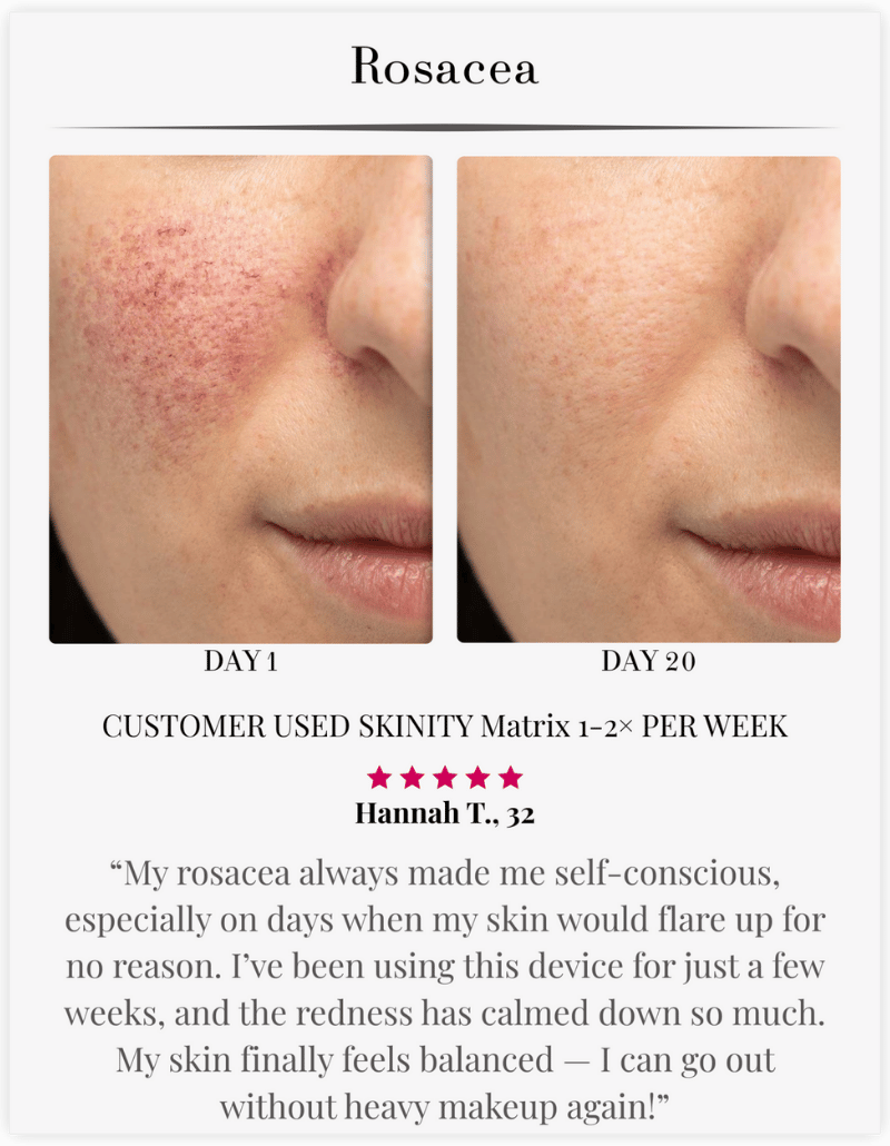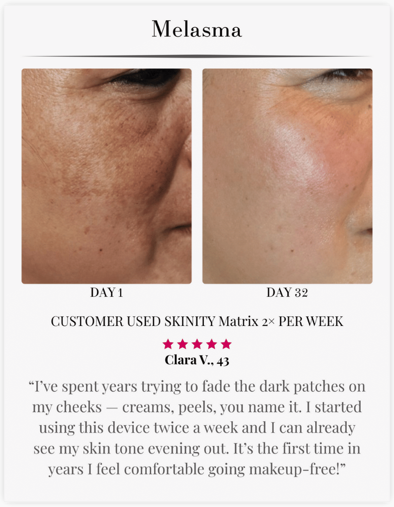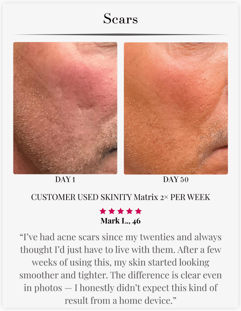 The Skinity Matrix brings that technology home. One investment gives you unlimited treatments, on your schedule, with the same clinical-grade results—without the clinic price tag or inconvenience.