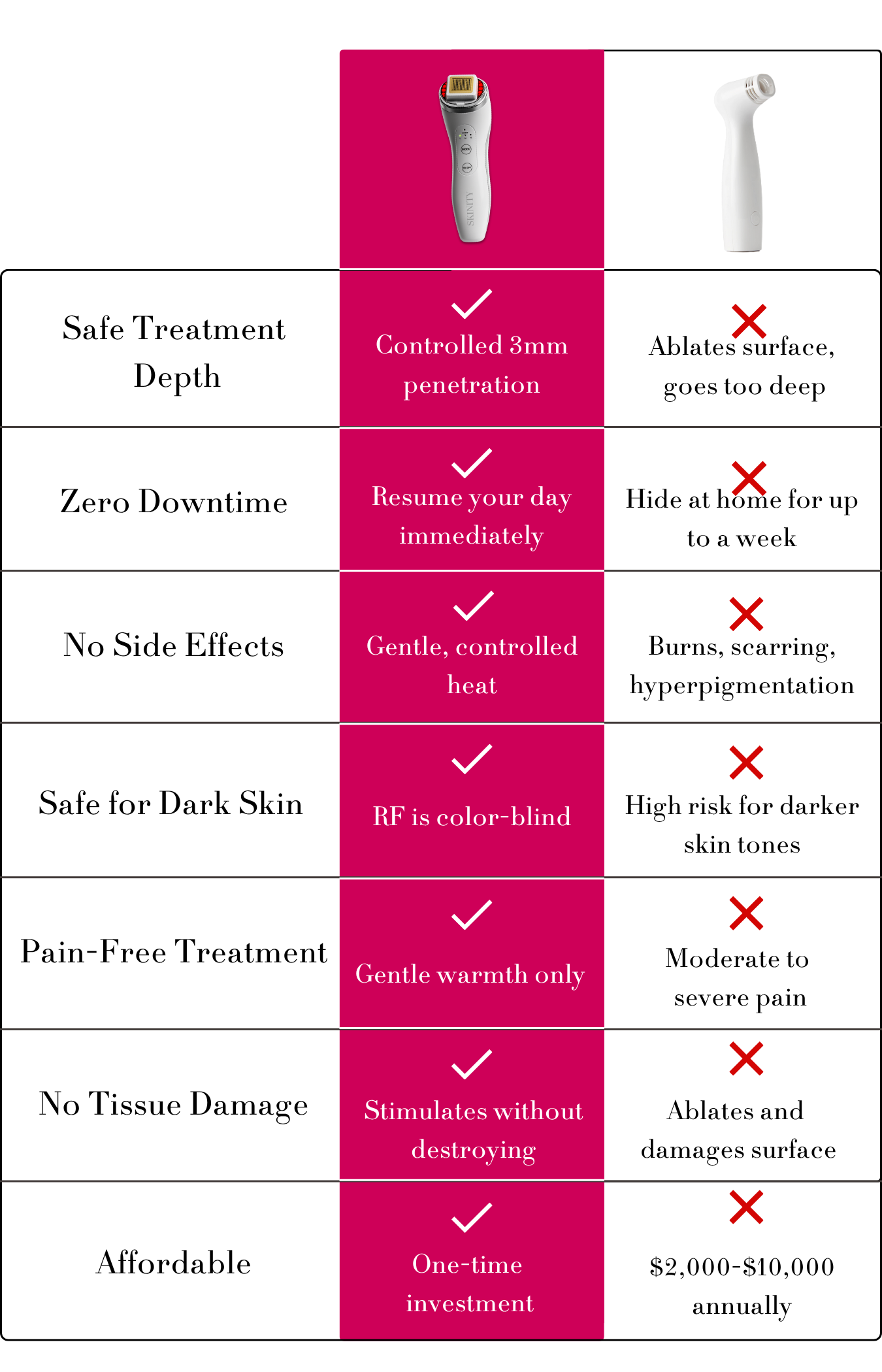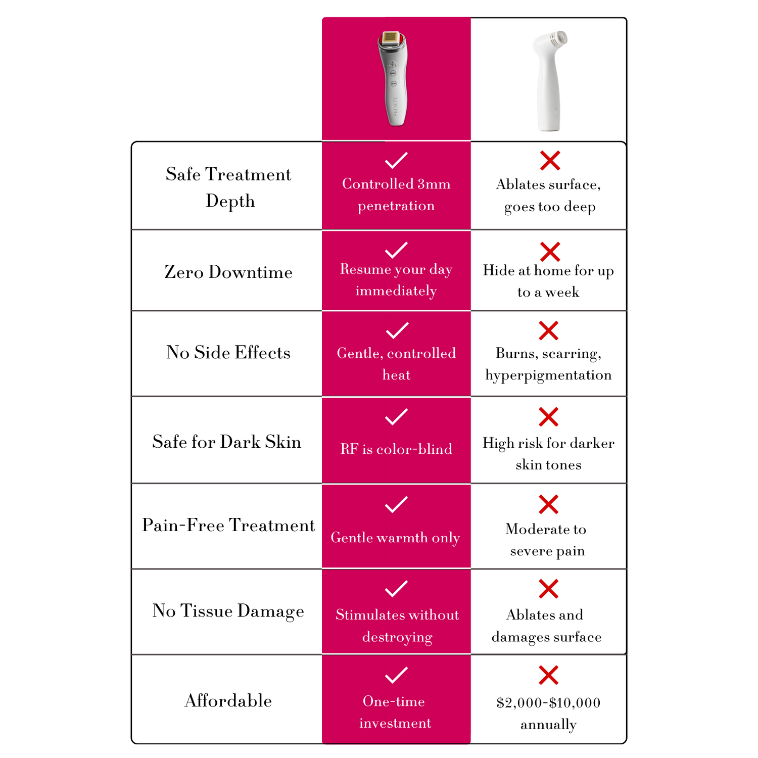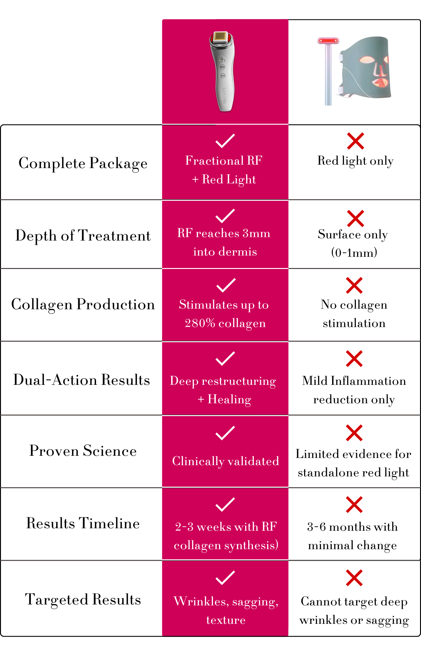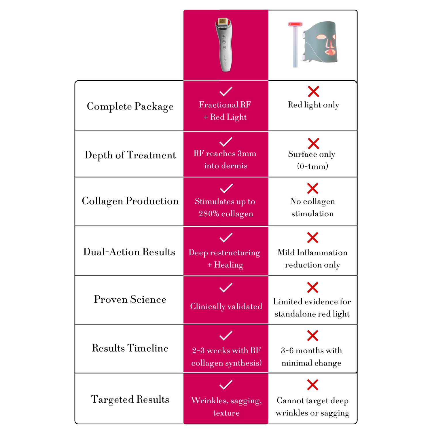The Skinity Matrix combines fractional RF technology that penetrates 3mm deep to stimulate genuine collagen production, PLUS red light for surface benefits. Get the complete solution, not half the story.