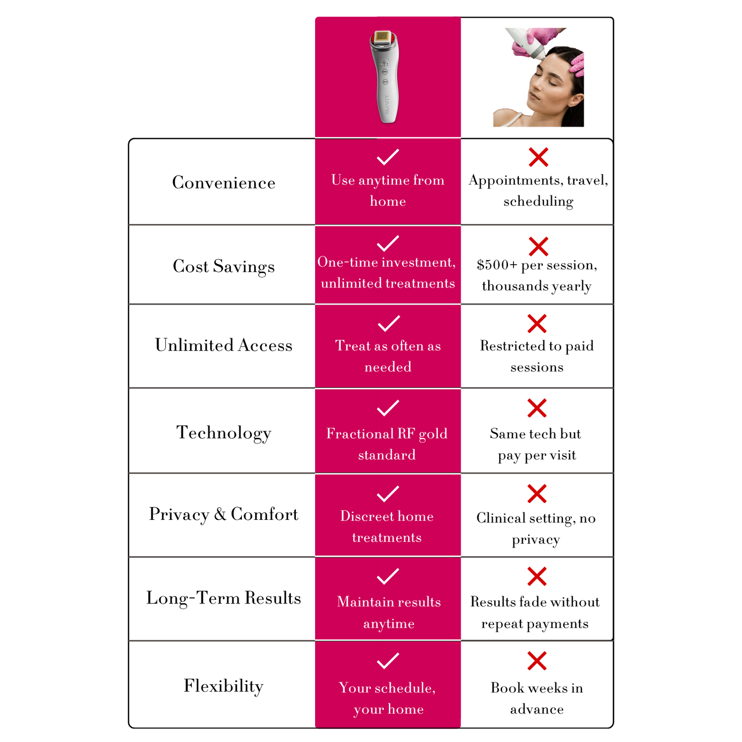 Professional RF treatments cost $500-$800 per session and require ongoing appointments to maintain results. You're paying thousands annually for the exact same fractional RF technology.